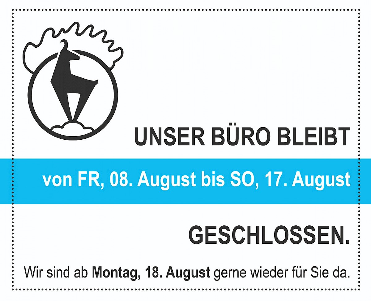 Unser Büro bleibt von Freitag, 08. August bis Sonntag, 17. August geschlossen.