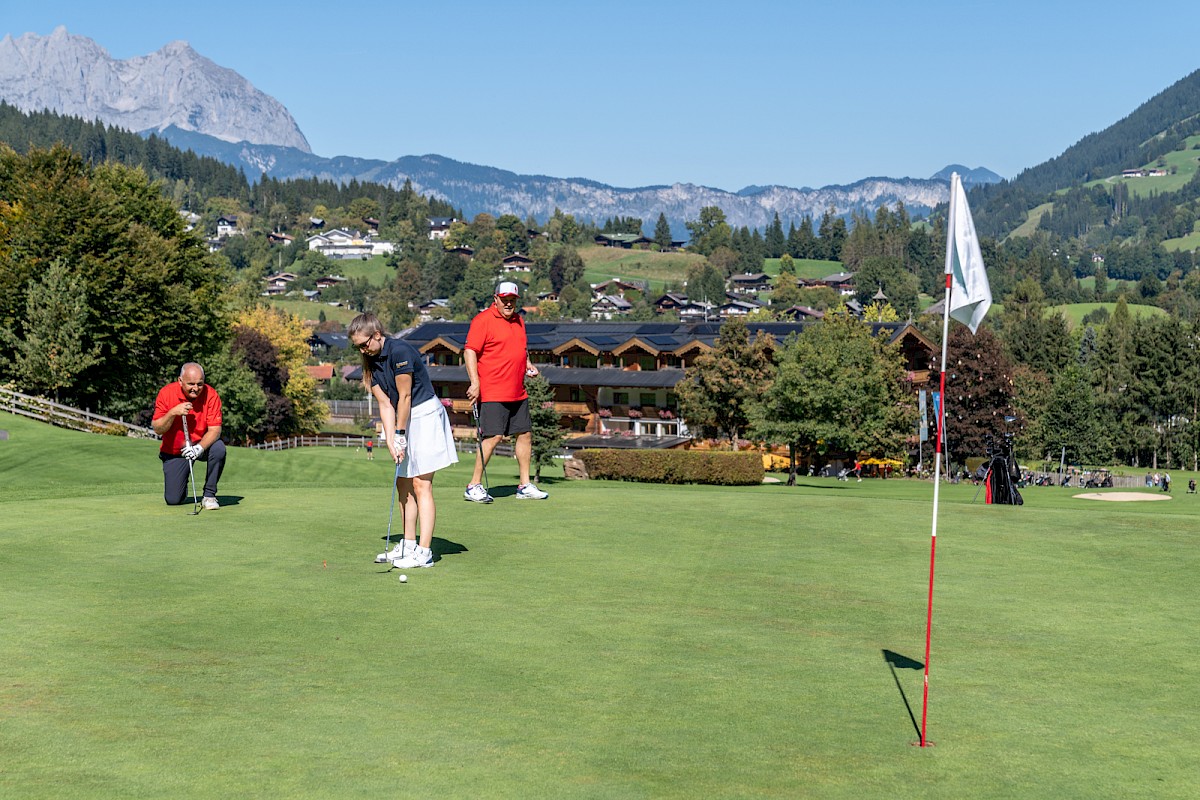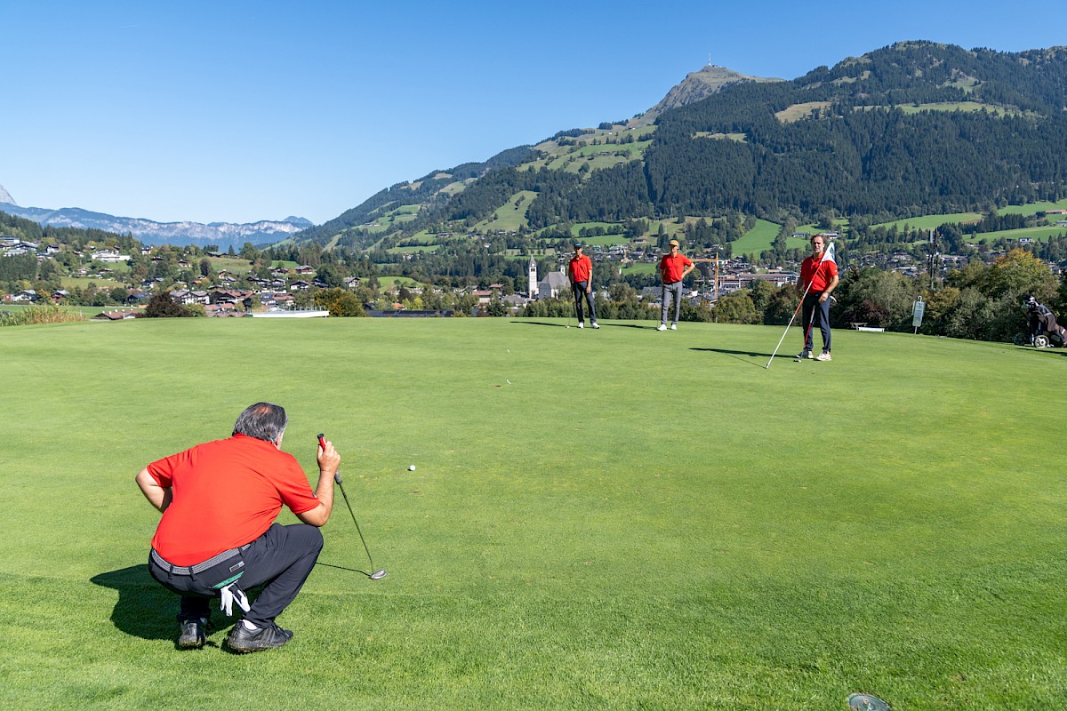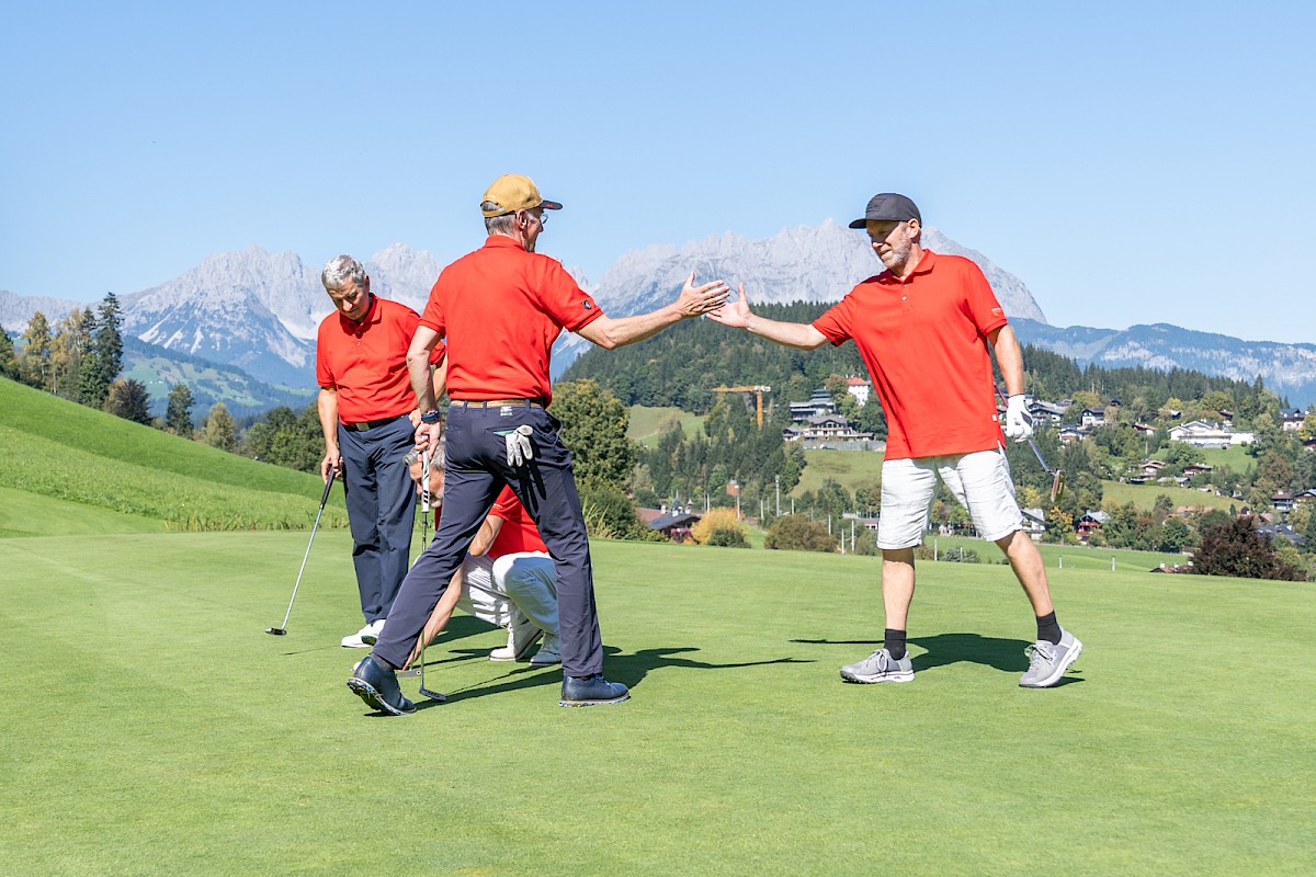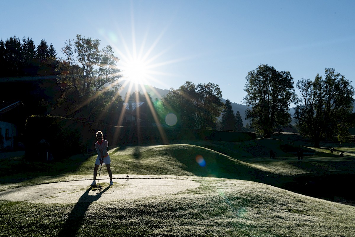 Kurz sorgte der erste Flight beim Toni Sailer Golf Memorial Freitagfrüh für Verwunderung, denn Signe Reisch, Josef Burger, Hermann Vötter und Andreas Reiter waren schon unterwegs, noch ehe die offizielle Startzeit um 7.20 Uhr angebrochen war. Aber eigentlich machten sie das einzig Richtige. Dieser Tag war einfach zu schön, um Zeit ungenützt verstreichen zu lassen. Der Morgen zeigte sich zwar noch richtig frisch, aber der Himmel dafür bereits strahlend blau und schon bald, machte sich der Zwiebellook bezahlt. Spätestens ab 10 Uhr zeigten selbst traditionell frierende Skiclubpräsidenten mehr Haut als üblich, so spätsommerlich warm wurde es in Kitzbühel.